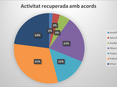 Així mateix, durant els anys 2024 i 2025, s’ha intensificat el treball per recuperar finques forestals i terrenys en alt estat d’abandonament, que representen el 60% de les finques inscrites al Banc. En la mateixa línia, en aquest període, s’han incorporat projectes d’apicultura i s’ha donat suport continuat a iniciatives de recuperació de pastures, que en aquest moment representen el 15% de la totalitat de les hectàrees amb acords.