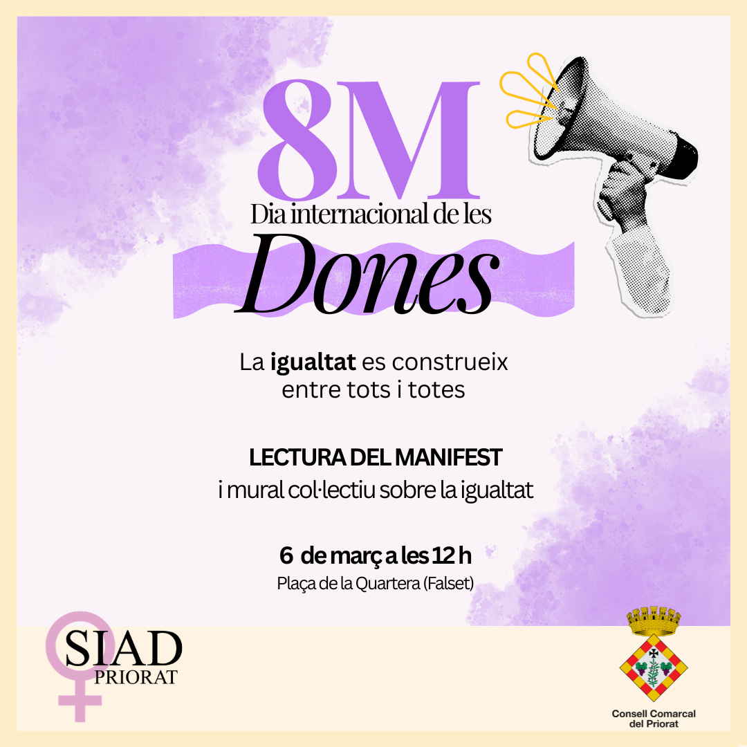 El proper 6 de març a les 12 h, la plaça de la Quartera de Falset acollirà l’acte institucional de commemoració del Dia Internacional de les Dones (8M), organitzat pel Servei d’Informació i Atenció a les Dones (SIAD) del Consell Comarcal del Priorat. L’acte, que comptarà amb la participació del president, Sergi Méndez, i de diversos representants de l’ens i de l’Ajuntament de Falset, inclourà la lectura del manifest institucional del 8M i una activitat col·laborativa en què les persones assistents podran aportar paraules i reflexions sobre el 8M, la igualtat avui i els reptes de futur.